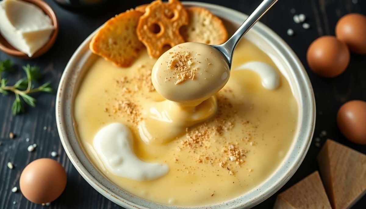 Pour une belle présentation, versez la fondue dans le caquelon et placez-le au centre de la table, accompagné de petits cubes de pain, légumes cuits à la vapeur ou morceaux de pommes de terre.