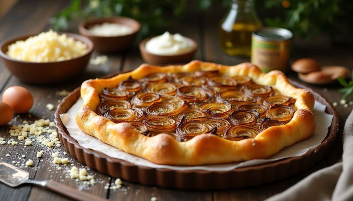 Originaire du nord de la France, notamment de la région alsacienne, la tarte à l'oignon est traditionnellement préparée avec des oignons frais. Cette version revisitée offre la possibilité de la savourer toute l'année.