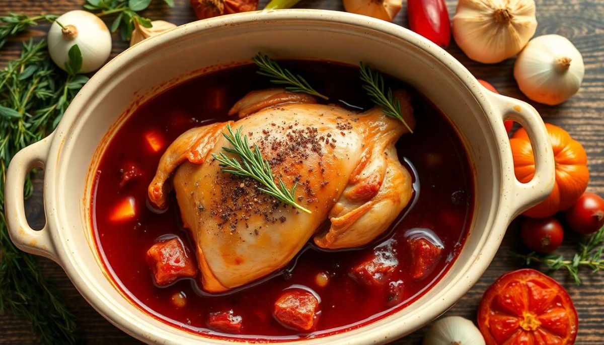 Plongez dans l'univers gourmand de la cocotte de chapon au vin rouge, un plat savoureux qui embaume votre maison d'un parfum enivrant d'épices et de viandes mijotées. Bien que ce plat fasse traditionnellement partie des occasions spéciales, sa préparation simple et abordable le rend parfait pour les repas en semaine.