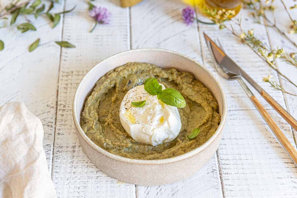 Pour une entrée estivale, servez ce caviar avec une demi-burrata par personne, un filet d'huile d'olive, une pincée de fleur de sel et quelques feuilles de basilic. Accompagné de pains pita dorés au four, c'est un vrai régal !