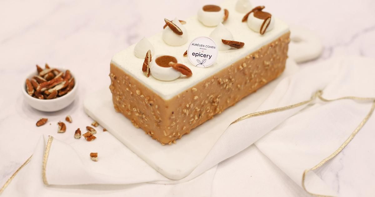 Pour clôturer un repas de fête de manière mémorable, rien ne vaut une bûche signée par un grand pâtissier. Pour cette saison, le talentueux Aurélien Cohen propose une création exclusive pour epicery. Inspirée par sa célèbre tartelette Dulcey-Pécan-Vanille, cette bûche se compose d'un cœur praliné aux noix de pécan, d'une ganache au chocolat dulcey, et d'une mousse à la vanille bio de Madagascar, le tout enveloppé d'un revêtement croquant. Une merveille pour les amateurs de sucreries.
