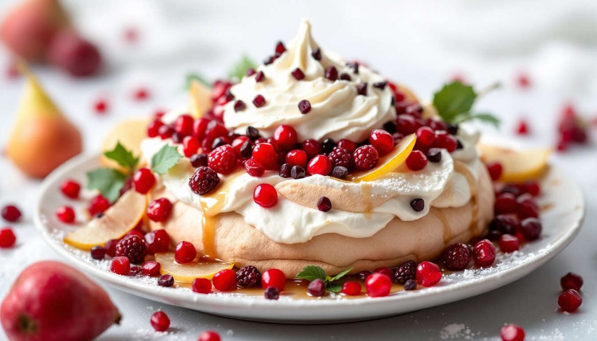 Ajoutez des noix concassées pour une texture croquante. Accompagnez votre pavlova d'un vin pétillant doux ou d'un thé noir pour profiter pleinement de ce dessert généreux.