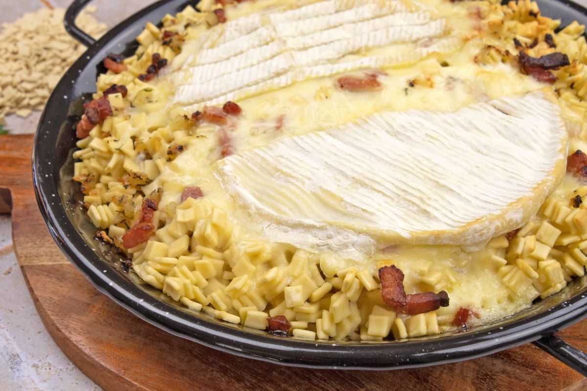 3. Pour le montage, commencez par placer les crozets au fond d'un plat en fonte. Ajoutez le mélange d'oignons et lardons, puis nappez de crème fraîche. Terminez en découpant le reblochon en tranches d'environ 0,5 cm et placez-les sur le dessus.