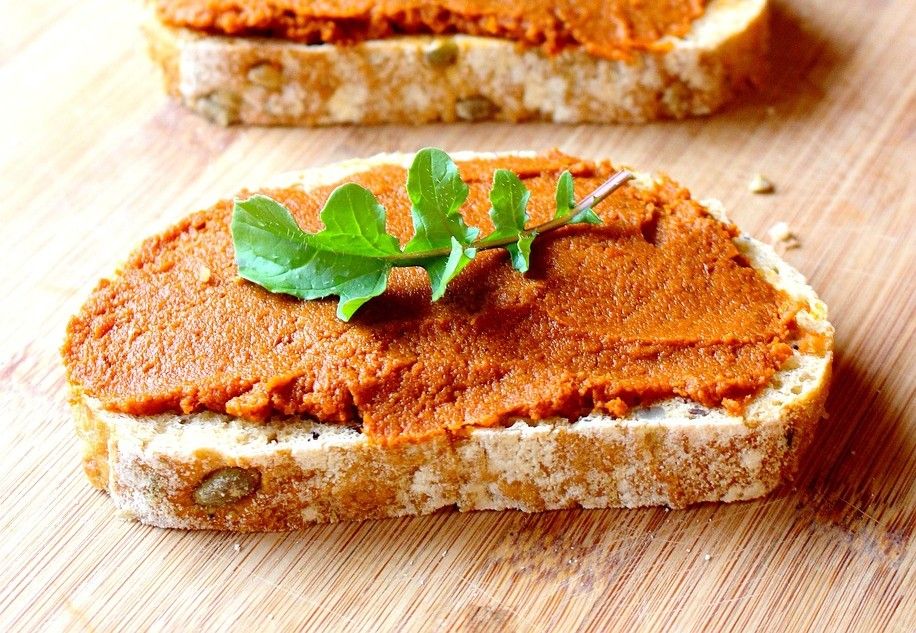Réhydratez les tomates séchées dans de l'eau chaude pendant 10 minutes. Mixez ensuite avec les noix de cajou, l'ail, le basilic et l'huile d'olive. Ajustez l'assaisonnement et servez avec du pain complet.