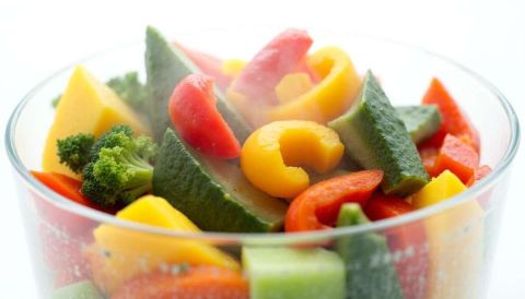 - Pendant ce temps, préparez l'accompagnement : coupez les patates douces, l'oignon et le céleri. Disposez le tout dans un plat, avec de l'ail et du thym, assaisonnez et ajoutez de l'huile d'olive. Faites cuire 20 minutes à 180°C.