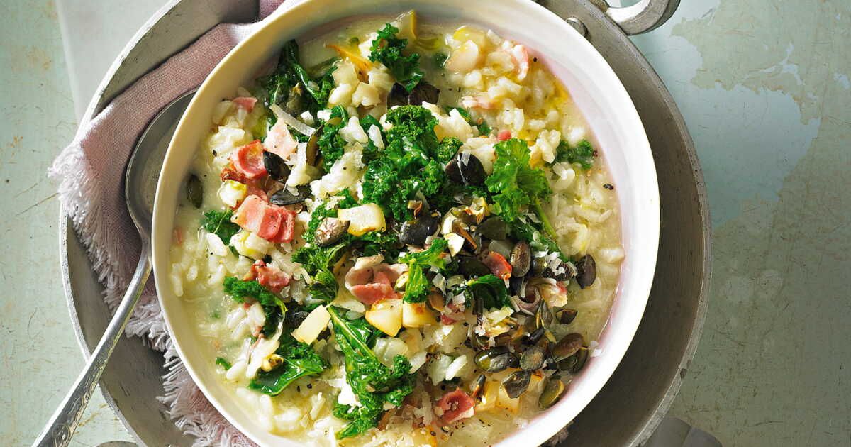 Servez chaud, décoré d'un peu de parmesan supplémentaire et de quelques feuilles de kale pour une belle présentation. Ce risotto est parfait pour un dîner chaleureux ou un repas convivial entre amis.